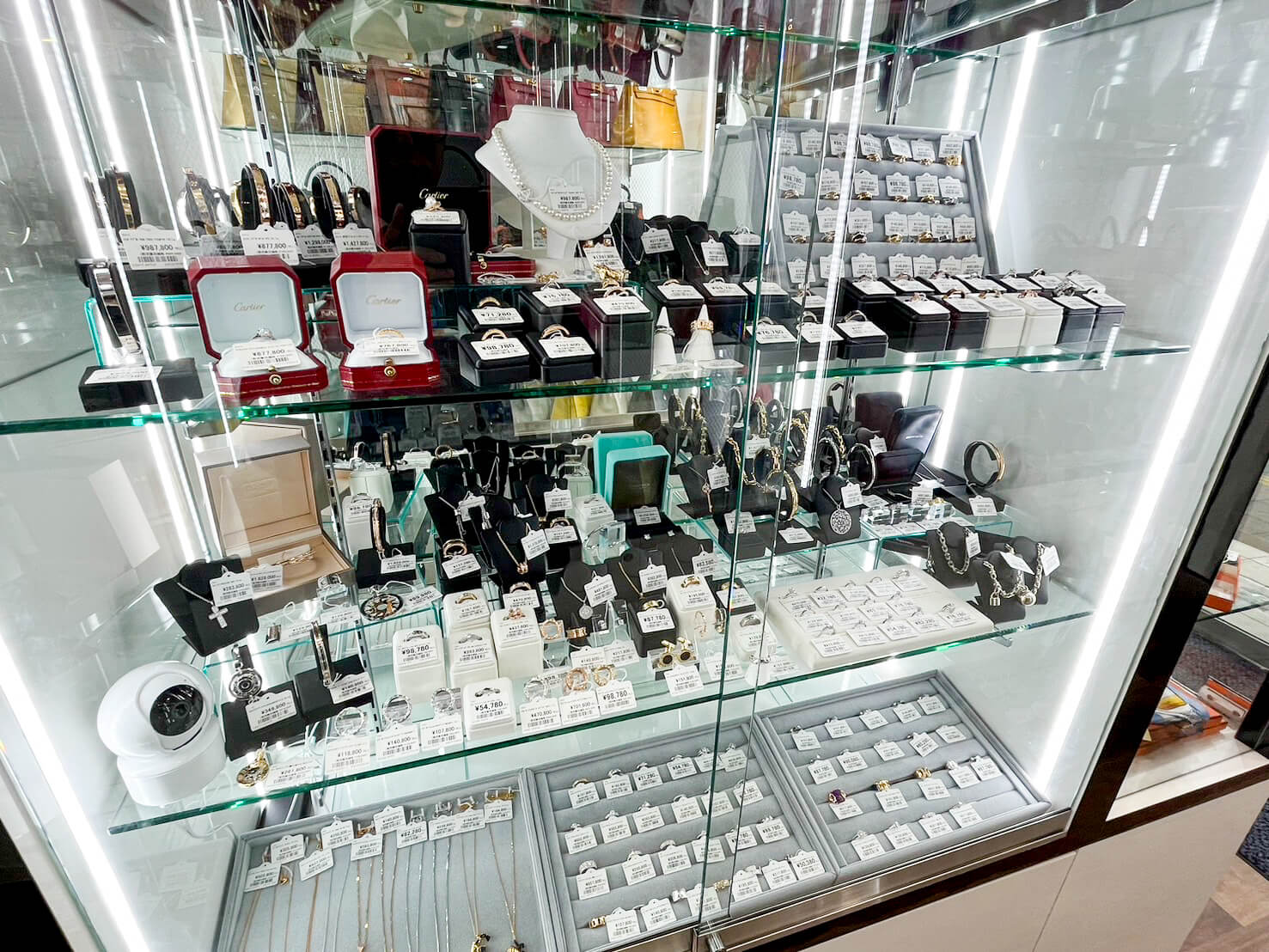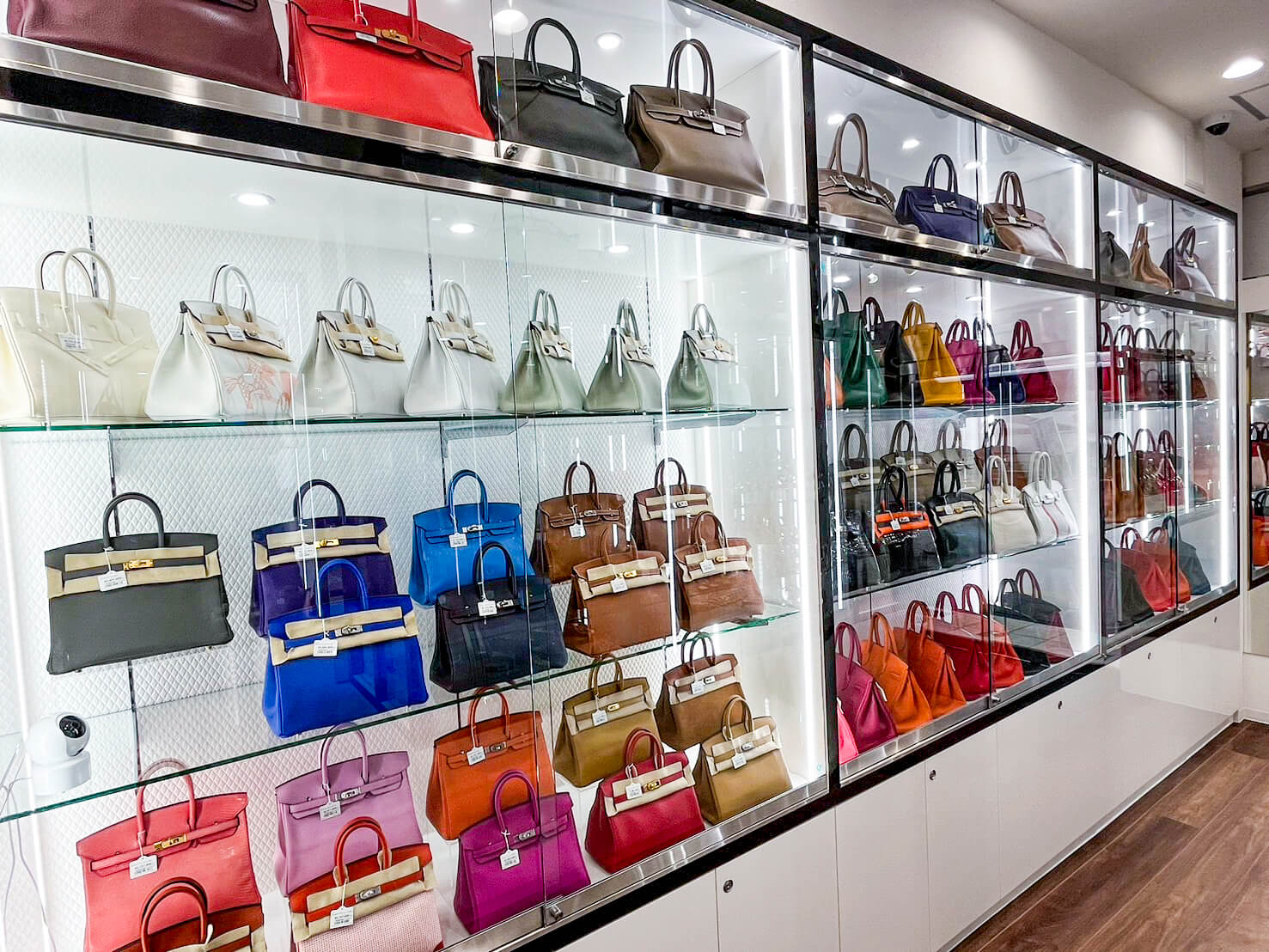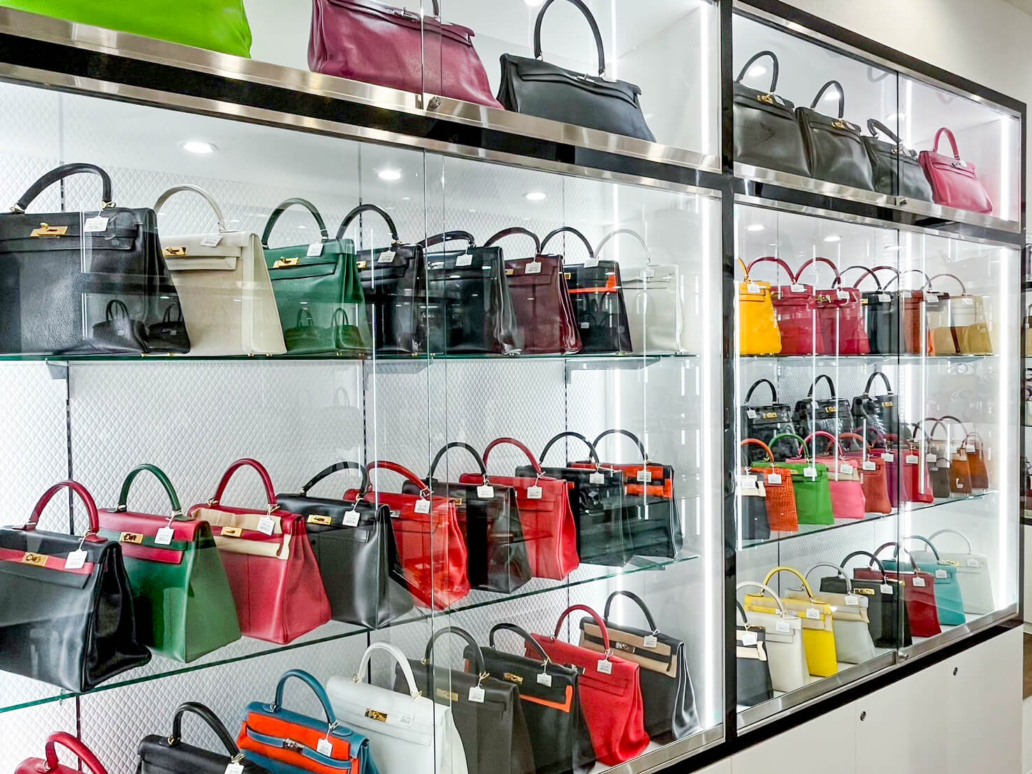 1Fの販売フロアは売り場面積12坪ながら、エルメスのバーキンやケリーを中心に、ロレックスやオメガなどの時計、カルティエやティファニー、ブルガリといったジュエリーを含め約700点を圧縮陳列。